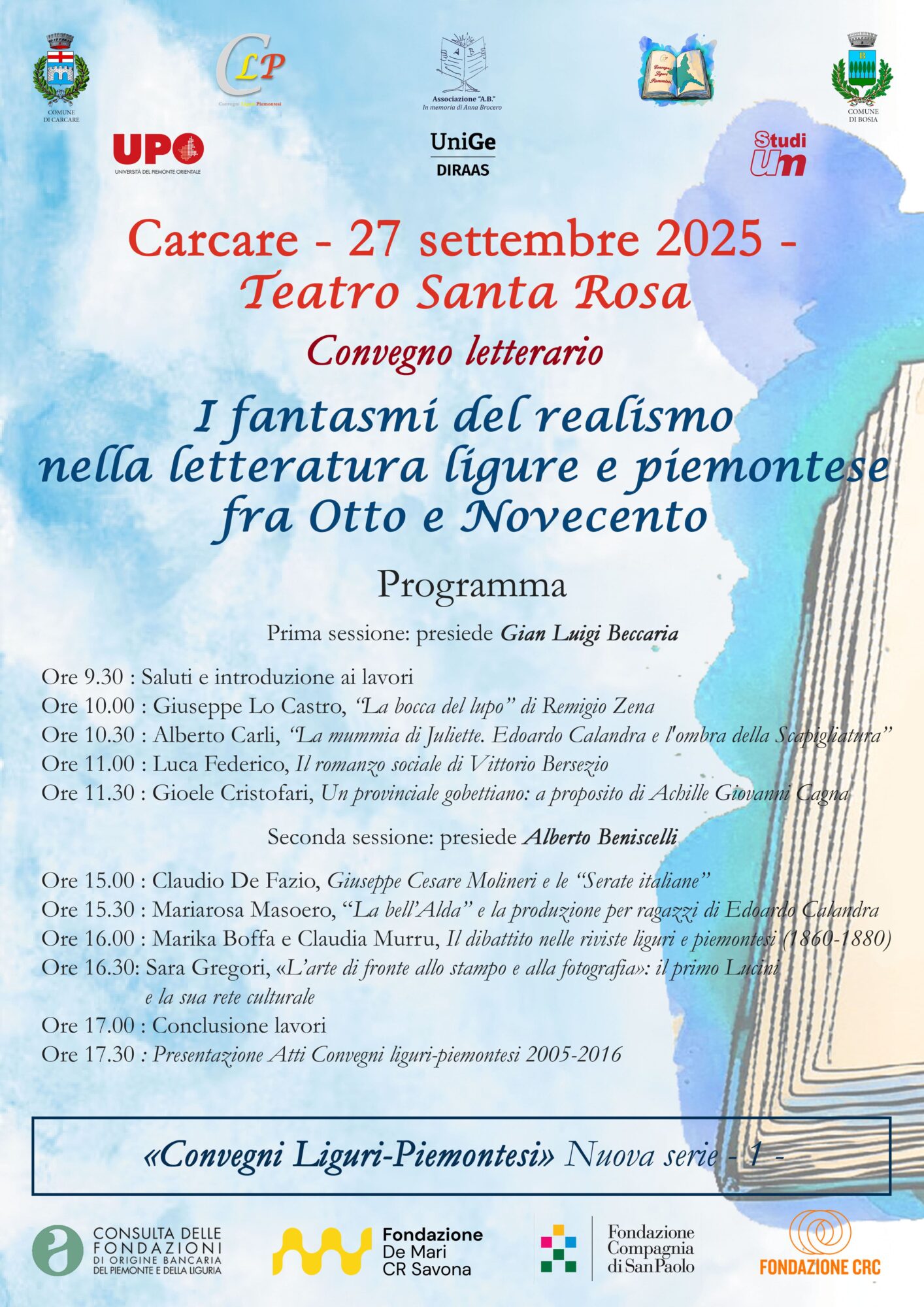 Tornano dopo nove anni di attesa i “Convegni liguri-piemontesi. Un ponte culturale tra Liguria e Piemonte”. L’appuntamento, immancabile, è per sabato 27 settembre al Teatro Santa Rosa di Carcare. Il tema del convegno sarà: “I fantasmi del realismo nella letteratura ligure e piemontese fra Otto e Novecento”.